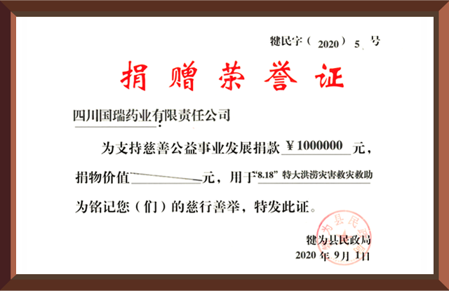 2020年8月18日,四川省犍为县遭遇百年未遇特大洪涝灾害,开云官方站网页版登录入口-开云(中国)集团国瑞药业向犍为县灾区捐赠现金100万元。